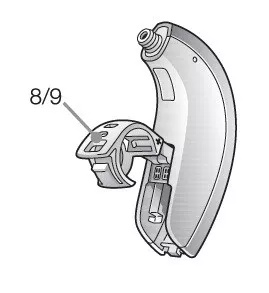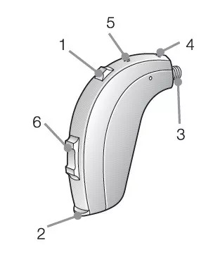 6. 音量鈕*:音量控制可用來增加或降低助聽器的音量:(1)向上按音量鈕,增加音量(2)向下按音量鈕,降低音量