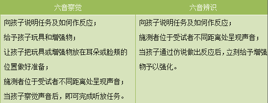 六音測試包括察覺和辨識,察覺最主要的方法是“六音聽放”,辨識的方法有指認、仿說、寫等。一歲以上的孩子就可以開始練習“六音聽放”了,有一定言語基礎后可以聽放和仿說結合或交替。