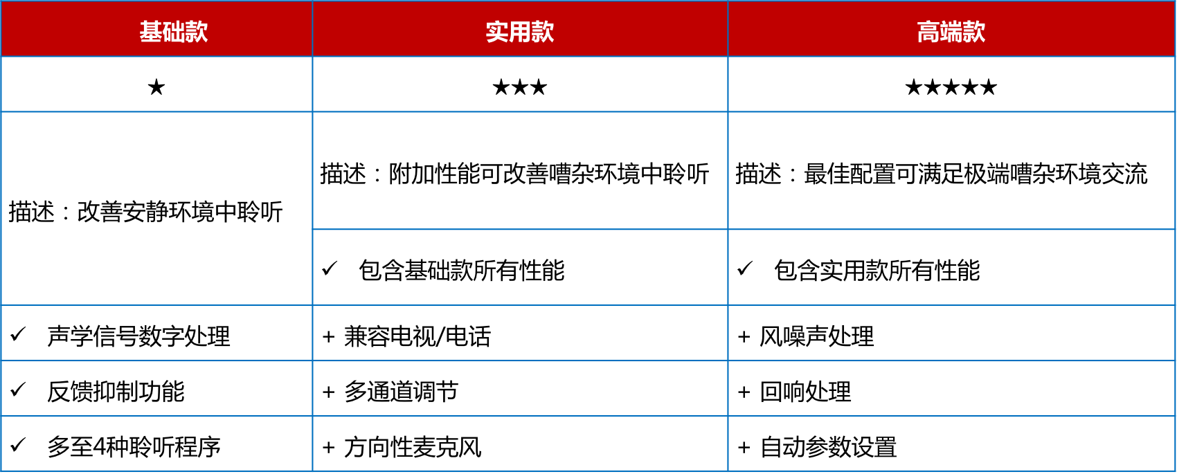 <span style="font-size:16px;"> 助聽器價格取決于機器的檔次,而檔次由內含的技術種類決定。助聽器檔次大致可分為基礎款、實用款、高端款。這三種檔次的區別請參見下表:</span></p><p style="text-align: center;"><span style="font-size:16px;"><img src="/upfiles/201808150226553383.png" width="640" alt="" /><br /></span></p><p><span style="font-size:16px;"> 那么,如何應該選擇哪種檔次的助聽器呢?</span></p><p><span style="font-size:16px;"> 選擇助聽器時主要需要考慮兩大因素。首先要考慮的就是弱聽人士的聽力損失程度,其次要考慮的就是弱聽人士的日常生活方式。比方說,某位弱聽人士是中度聽力損失,日常在家為主,那么實用款檔次助聽器通??梢詽M足TA的需求。</span></p><p><span style="font-size:16px;"> 當然,這里只是為助聽器選配提供了大致方向,如何選配仍然需要具體情況具體分析,最好還是需要跟驗配師面對面溝通。</span></p><p><span style="font-size:16px;"> 1、高端款助聽器</span></p><p><span style="font-size:16px;"> 不同廠家的高端款助聽器均代表了各自的尖端技術,并致力于提供最佳的音質。</span></p><p><span style="font-size:16px;"> 這類助聽器高端之處在于自動適應各種聆聽環境,最優化佩戴者的聆聽清晰度和舒適度,讓佩戴者在極度嘈雜的環境中,如咖啡館,也能清晰地聽到同伴的言語聲。常見性能包括:</span></p><p><span style="font-size:16px;"> (1) 多種外觀、顏色可選;</span></p><p><span style="font-size:16px;"> (2) 環境自適應;</span></p><p><span style="font-size:16px;"> (3) 360°信號追蹤;</span></p><p><span style="font-size:16px;"> (4) 兼容各種藍牙設備。</span></p><p><span style="font-size:16px;"> 高端款助聽器為什么能夠自動適應各種聆聽環境呢?這是因為左右兩側的高端款助聽器能夠相互“通電報”,精準判斷所處的聆聽環境并自主學習,給出最佳的助聽設置。</span></p><p><span style="font-size:16px;"> 比如,您經常出入一家書店,每次您進入這家書店時總是習慣性地將音量調低2分貝;長此以往,當您再次進入該書店時,兩臺助聽器將會默契地降低2分貝。</span></p><p><span style="font-size:16px;"> 360°信號追蹤可以幫助佩戴者建立更佳的空間感知,對所處環境有充足的把控和預判,避免一些潛在的危險。而當助聽器連接至各種藍牙設備時,聆聽清晰度會更高,且不會打擾其他人。</span></p><p><span style="font-size:16px;"> 比如家人總是抱怨您把電視機聲音開得太大,拒絕跟您一起觀看電視時,您可以選配能夠兼容電視的助聽器,并進行獨立的音量調節,而家人只需設置為常規音量即可。高端款助聽器的價位一般在15000以上。</span></p><p style="text-align: center;"><span style="font-size:16px;"><img src="/upfiles/201808150228328500.jpg" alt="" /><br /></span></p><p><span style="font-size:16px;"> 2、實用款助聽器</span></p><p><span style="font-size:16px;"> 實用款助聽器的價格一般在8000~15000之間。實用款助聽器包含一定的降噪技術和言語提升功能,可以滿足大多數環境中的聆聽需求。部分廠家的實用款助聽器也可兼容各種藍牙設備。實用款助聽器的突出性能大致包括:</span></p><p><span style="font-size:16px;"> (1) 可連接外接音源;</span></p><p><span style="font-size:16px;"> (2) 言語清晰度提升;</span></p><p><span style="font-size:16px;"> (3) 方向性功能。</span></p><p><span style="font-size:16px;"> 3、基礎款助聽器</span></p><p><span style="font-size:16px;"> 基礎款助聽器的價位一般在8000以下。基礎款助聽器能夠滿足安靜環境中的交流需求,并具備反饋管理功能。反饋管理功能能夠有效提升佩戴舒適度,避免在日常佩戴過程中出現尖銳的干擾聲。</span></p><p><span style="font-size:16px;"> 基礎款助聽器適用于經常在家的弱聽人士,若是生活方式比較豐富多彩的弱聽人士建議選配其他檔次的助聽器。實用款助聽器的突出性能大致包括:</span></p><p><span style="font-size:16px;"> (1) 數字信號處理技術;</span></p><p><span style="font-size:16px;"> (2) 反饋管理功能;</span></p><p><span style="font-size:16px;"> (3) 多種聆聽程序可選。</span></p><p><span style="font-size:16px;"> 更多詳情請登錄www.sdhuijia.cn。</span></p>" />