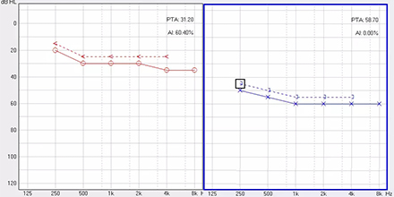<span style="font-size:16px;"> 純音聽閾測試是聽力學所有測試項目中最基本的一項內容,包括氣導(AC)、骨導(BC)、最舒適閾(MCL)與不舒適閾(UCL)測試。測試結果能夠直接反映患者雙耳的聽力損失程度、性質與動態范圍,還能夠間接反映患者的患病位置、病因與助聽后效果。</span></p><p><span style="font-size:16px;"> 一般地,整個檢查控制在10分鐘左右,既能全面做完檢查,又不至患者疲憊而影響主觀反應。</span></p><p><span style="font-size:16px;"> 純音聽閾測試是最考驗聽力學工作者實際工作能力的一項基本內容:</span></p><p><span style="font-size:16px;"> 1、若患者曾長期暴露于噪聲中,且無其它致聾因素,很可能在3 kHz或6 kHz出現明顯的下降,聽力曲線呈現“V”字形,所以除了常規的倍頻程頻率外,還要加測這兩個頻率,否則就犧牲了多通道助聽器的意義;</span></p><p><span style="font-size:16px;"> 除了有過噪聲接觸史的患者需要加測半倍頻程外,涉及聲場助聽聽閾評估、賠償等情況都需要加測半倍頻程。</span></p><p><span style="font-size:16px;"> 耳鳴困擾的患者,注意避免與耳鳴聲類似的純音,若還用純音作為刺激聲,患者就會分辨不清,出現假陽性或假陰性。所以,測試者要換成囀音,既有別于耳鳴聲,又具有頻率特異性。</span></p><p><span style="font-size:16px;"> 2、不舒適閾反映患者對大聲的忍耐力,不舒適閾與氣導的差值能顯示患者的動態范圍,指導驗配師調節助聽器的最大輸出。</span></p><p><span style="font-size:16px;"> 不舒適閾測試頻率是否越多越好呢?非也。測得頻率過多,一會引起患者疲勞或不適,二是沒必要,大多數助聽器的最大輸出是一個整體,不能像調增益和壓縮那樣分通道,所以測多了并無好處,一般測0.5、1、2、4 kHz。</span></p><p><span style="font-size:16px;"> 3、如果兩側聽力有明顯差異,此時就要準備好掩蔽了,分為氣導掩蔽與骨導掩蔽。</span></p><p><span style="font-size:16px;"> (1)氣導掩蔽的判斷有兩個原則,只要符合其中一個原則,就需要重新測差耳氣導。具體做法是:</span></p><p><span style="font-size:16px;"> 測試完雙耳氣導,若發現某一頻率差耳氣導閾值比好耳氣導閾值多40 dB以上就要懷疑有可能是好耳偷聽的,需要給好耳氣導加掩蔽聲;</span></p><p><span style="font-size:16px;"> 測試完雙耳氣導與好耳骨導,若發現某一頻率差耳氣導閾值比好耳骨導閾值多40 dB以上就要懷疑有可能是好耳偷聽的,需要給好耳氣導加掩蔽聲。</span></p><p><span style="font-size:16px;"> 下面為未掩蔽的聽力圖:</span></p><center><span style="font-size:16px;"><img alt="" src="/upfiles/201810160133207570.png" width="440" height="220" /></span></center><p></p><p><span style="font-size:16px;"> 下圖為掩蔽后的左耳真實氣導值:</span></p><center><span style="font-size:16px;"><img alt="" src="/upfiles/201810160133289538.png" width="440" height="220" /></span></center><p></p><p><span style="font-size:16px;"> (2)骨導掩蔽的判斷原則:</span></p><p><span style="font-size:16px;"> 測試完雙耳氣導與好耳骨導,若發現某一頻率差耳氣導閾值比好耳骨導閾值大于等于15 dB就必須予以掩蔽,重測骨導。下圖為右耳氣導加掩蔽后左耳骨導的真實值:</span></p><center><span style="font-size:16px;"><img alt="" src="/upfiles/201810160133368026.png" width="440" height="220" /></span></center><p></p><p><span style="font-size:16px;"> 注意:</span></p><p><span style="font-size:16px;"> 1)掩蔽的規則要按順序適用;</span></p><p><span style="font-size:16px;"> 2)各頻率根據規則決定是否需要加掩蔽;</span></p><p><span style="font-size:16px;"> 3)很少需要掩蔽所有頻率,通常氣導掩蔽頻率不應超三個,骨導掩蔽頻率不應超兩個,否則受試者會疲憊不堪。</span></p><p><span style="font-size:16px;"> 醫院測聽的主要目的是診斷和鑒別聽力損失的性質和程度,驗配中心的主要目的是盡可能地幫助患者選擇并調試好助聽器。</span></p><p><span style="font-size:16px;"> 更多詳情請登錄www.sdhuijia.cn</span></p>" />