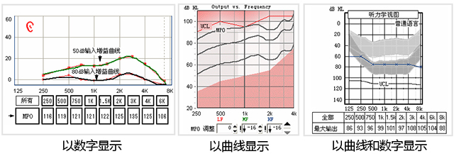 不同助聽器廠家軟件上MPO的顯示界面各有不同,有些是純曲線的,有些是曲線加數字的,還有些是純數字的。
