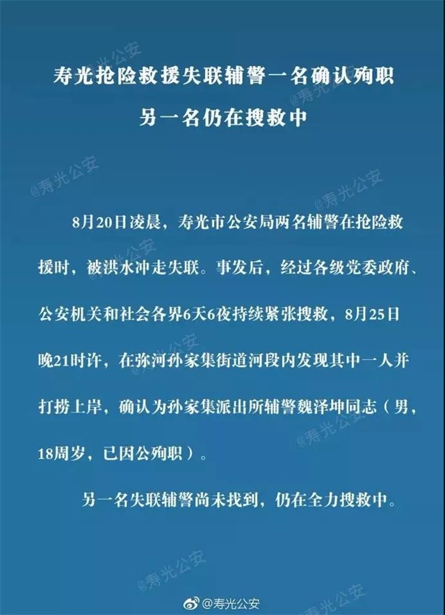 <span style="font-size: 16px;"> 2018年8月20日凌晨,壽光市兩名輔警在搶險救援時,被洪水沖走失聯。事發后,經過連續幾天的緊張搜救,他們以我們最不愿意看到的方式歸來了。</span></p><p><span style="font-size: 16px;"> 8月25日晚21時許,在彌河孫家集街道河段內發現一人,確認為孫家集派出所輔警魏澤坤同志(男,18周歲,因公殉職)。</span></p><p><span style="font-size: 16px;"> 8月28日下午16時,在彌河孫家集街道河段西岸發現另一名輔警,確認為孫家集派出所孫超同志(男,33歲,因公殉職)。</span></p><p><span style="font-size: 16px;"> 他是家里的頂梁柱啊</span></p><p><span style="font-size: 16px;"> 33歲的孫超是家里的頂梁柱,他的愛人郭立華是聽覺有道的店長。</span></p><p><span style="font-size: 16px;"> 孫超有一子一女,大女兒才滿10歲,父母年近60,身體都不是很好。還有一個85歲的老奶奶,身體也不好,孫超失蹤時,一家人一直都不敢告訴她消息。</span></p><p><span style="font-size: 16px;"> 18日早,因為下雨,孫超怕路不好走,還提前送郭店長到門店上班,然后才回派出所。</span></p><p><span style="font-size: 16px;"> 事發前2小時,他們夫妻互通了電話。孫超說,自己全身濕透了,水很大,11點之后,就沒有了音訊。</span></p><p><span style="font-size: 16px;"> 他們夫妻倆都是好員工,孫超還是共產黨員,他們沒有好好地拍過幾張全家福,甚至沒能抽空一家人好好玩一天。</span></p><p><span style="font-size: 16px;"> 孫超是個好老公,他一回家就看孩子,哄孩子睡覺,一有空就給老婆孩子洗衣服。為了省錢養家,他連幾十塊錢的鞋子都舍不得買,老婆給他買回來了,他還不舍得穿……</span></p><p><span style="font-size: 16px;"> 對于我們而言,郭店長和孫超都像家人一樣,我們多么期盼他是平平安安地回來。</span></p><p><span style="font-size: 16px;"> 化作春泥更護花</span></p><p><span style="font-size: 16px;"> 兩位輔警失蹤的幾天,我們看到了人們對英雄的珍惜。</span></p><p><span style="font-size: 16px;"> 濰坊市調集了1000多名警力、700多名沿河鎮街干部群眾、11支專業救援隊、18艘沖鋒舟、20架無人機、10頭搜救犬等,全線展開大范圍搜尋。</span></p><p><span style="font-size: 16px;"> 還有很多人民群眾,也自發參與了本次救援,總計6000多人,為了找到2個人,找了幾天幾夜,很多人都沒怎么好好睡覺。</span></p><p><span style="font-size: 16px;"> 他們最希望的,是把他們安全帶回來。反正無論如何,都要把他們找到。</span></p><p><center><img src="/upfiles/201808310437256664.jpg" alt="" /></center><center><br /></center><center> <img src="/upfiles/20180831043725120.jpg" alt="" /> </center><center><br /></center><center><img src="/upfiles/20180831043725884.jpg" alt="" /> </center><center><br /></center><center><img src="/upfiles/201808310437253890.jpg" alt="" /></center><center><br /></center><center> <img src="/upfiles/201808310437262486.jpg" alt="" /> </center><center><br /></center><center><img src="/upfiles/20180831043726269.jpg" alt="" /></center><center><br /></center><center> <img src="/upfiles/201808310437264172.jpg" alt="" /> </center><center><br /></center><center><img src="/upfiles/201808310437261506.jpg" alt="" /></center><center><br /></center><center> <img src="/upfiles/201808310437267495.jpg" alt="" /></center><center><br /></center><center> <img src="/upfiles/201808310437262138.jpg" alt="" /><span style="font-size: 16px;"> </span><span style="font-size: 16px;"> </span></center></p><p></p><p><span style="font-size: 16px;"> 而很多人,在各個地方關注著這一切。</span></p><p><span style="font-size: 16px;"> 他們可能身處中國的各個角落,平時有各自的愛好,從事著不同的職業,跟我們一樣,他們也都為兩位輔警擔憂過,祈禱過。</span></p><p><center><span style="font-size: 16px;"> <img src="/upfiles/201808310438352320.jpg" alt="" /> </span></center><center><span style="font-size: 16px;"><br /></span></center><center><span style="font-size: 16px;"><img src="/upfiles/201808310438359206.jpg" alt="" /></span></center><center><span style="font-size: 16px;"><br /></span></center><center><span style="font-size: 16px;"> <img src="/upfiles/201808310438359231.jpg" alt="" /></span></center></p><p></p><p><span style="font-size: 16px;"> 令人惋惜和哀痛的是,我們沒能等到想要的結局。但我們深知,兩位輔警并沒有徹底消失,在這片他們生活過的土地上,每一個角落都存在著他們的身影。</span></p><p><span style="font-size: 16px;"> 愿英雄安息</span></p><p><span style="font-size: 16px;"> 唯物者不信鬼神的存在,但兩位輔警的精神定與日月同輝;風雨飄搖盡顯英雄本色,被風雨洗禮的人們會記住孫超、魏澤坤這兩個名字,因為他們生命的最后一刻,始終代表著人民的名義。</span></p><p><span style="font-size: 16px;"> 兩位英雄,他們為了搶險救援,離開了人世。</span></p><p><span style="font-size: 16px;"> 他們把最美好的青春歲月獻給了警營,留給了老百姓,卻還沒來得及跟自己的家人說一聲再見,多么令人哀痛和讓人崇敬!</span></p><p style="text-align: center;"><span style="font-size: 16px;"><img src="/upfiles/201808310439091398.jpg" alt="" /></span></p><p style="text-align: center;"><span style="font-size: 16px;"><br /></span></p><p style="text-align: center;"><span style="font-size: 16px;"> <img src="/upfiles/201808310439095302.jpg" alt="" /></span></p><p style="text-align: center;"><span style="font-size: 16px;"><br /></span></p><p style="text-align: center;"><span style="font-size: 16px;"> <img src="/upfiles/201808310439092187.jpg" alt="" /> <br /></span></p><p></p><p><span style="font-size: 16px;"> 他們的親人會記住他們,國家會記住他們,我們會記住他